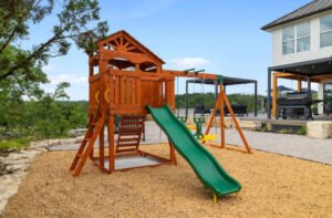 A seamless design-build transformation featuring custom-engineered stone paving, firepits, custom retaining walls, playground features, and naturally superior outdoor living defined by Certified Expertise.